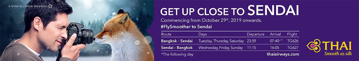 It has become easier to reach Sendai now with direct flights from Bangkok on Thai Airways flying three times a week. Starting 29th October, Thai Airways offers round trips from the golden city of Bangkok to the woodland-enveloped Sendai. Their Boeing 777-200 aircraft, with 30 elegant seats in Royal Silk class and more than 270 seats in Economy class, accommodates travelers with sublime hospitality Thai Airways is known for. For more information visit www.thaiairways.com ◼Subscribe to the latest edition now by clicking here.